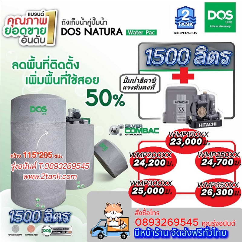 ถังเก็บน้ำ DOS NATURA Water Pac (สีเทา) พร้อมปั๊มน้ำฮิตาชิแรงดันคงที่ WMP150XX2,WMP200XX2,WMP250XX2,WMP300XX2,WMP350XX2 ราคาพิเศษ มีหน้าร้านส่งฟรีทั่วไทย โทร 0893269545 คุณรุ่งอนันต์